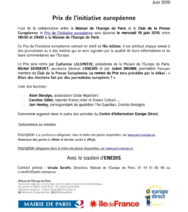 Navigation de l’article Le prix de l’initiative européenne sera remis le mercredi 19 juin à 18h30 à la Maison de l’Europe de Paris par sa présidente Catherine Lalumière
